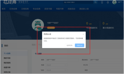 第三步:账号注册后,选择认证机构,弹出机构认证页面,点击【快捷认证】或选择/检索【广东理工职业学院】实现认证后开启阅读学习之旅。