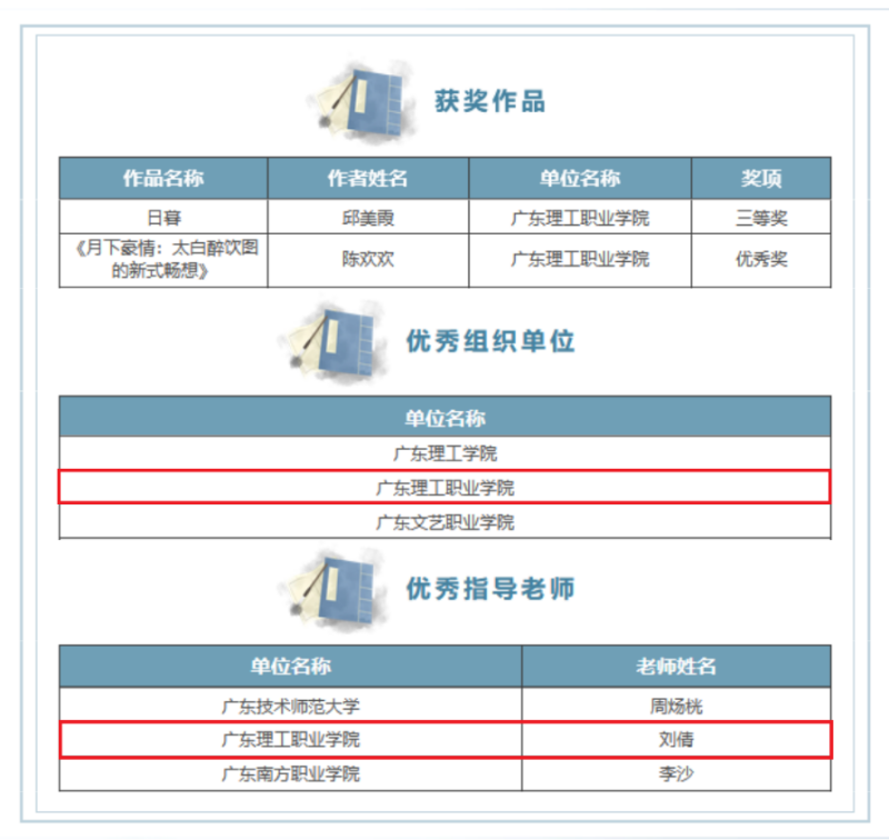 近日,首届广东省高校“书香浸润”中华诗词美育作品创作大赛获奖名单正式公布,图书馆积极组织我校师生参与,共荣获四项奖项。其中,邱美霞同学的作品《日暮》荣获三等奖,陈欢欢同学凭借《月下豪情:太白醉饮图的新式畅想》获得优秀奖,刘倩老师获评“优秀指导老师”,学校被授予“优秀组织单位奖”。